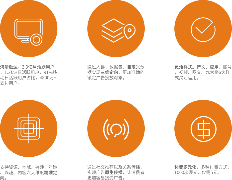 微博“粉丝通”会出现在微博信息流的顶部或微博信息流靠近顶部的位置(包括PC和官方移动客户端);微博精准广告投放引擎会根据微博的社交关系、相关性、热门程度等条件,来决定微博“粉丝通”不同的展现位置。